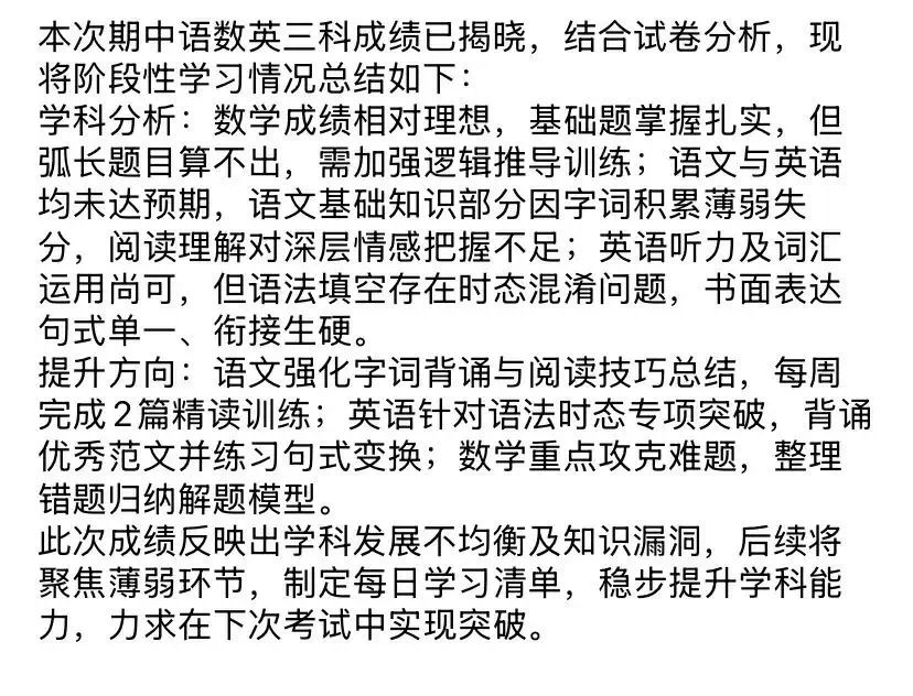 提升方向:语文强化字词背诵与阅读技巧总结,每周完成2篇精读训练;英语针对语法时态专项突破,背诵优秀范文并练习句式变换;数学重点攻克难题,整理错题归纳解题模型。