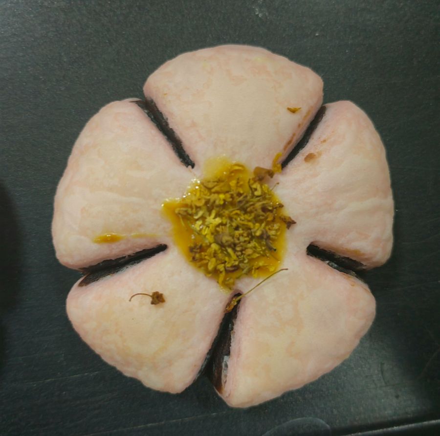 4. 包馅烘烤:取面团按压擀圆,包入25g豆沙馅,收口朝下搓圆,用刀在顶部划4-5道十字花刀(不切断),刷一层蛋黄液,点缀黑芝麻。