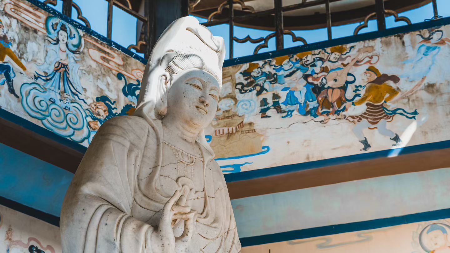 青釉观音像垂眸凝思,眉眼间的温润慈悲穿透岁月而来。指尖轻拈的绿枝鲜活灵动,似要将生机与福泽递向世间,衣袂上的彩绘虽历时光,仍能窥见昔日的精致纹样。金饰璎珞错落有致,衬得观音身姿愈发温婉静谧。身后的群像错落排布,暗合着众生相依的禅意,暗黄的光影漫过衣袍,晕开柔和的光晕。这尊观音像以细腻的工艺诠释着慈悲,静谧的氛围里,浮躁心绪皆被抚平,只余心安与虔诚。