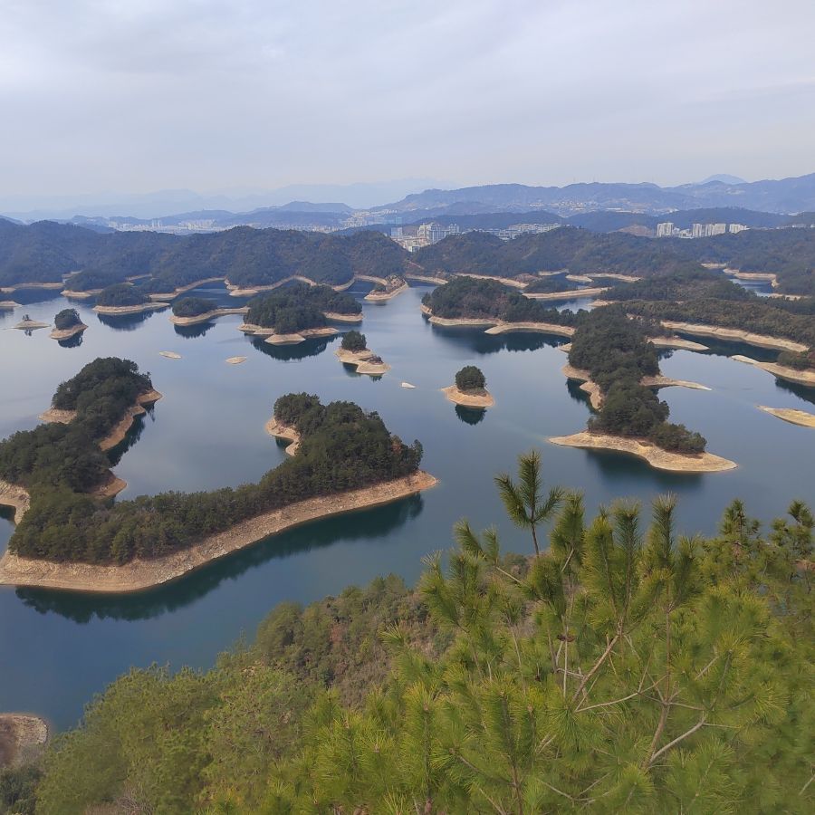 登高望远,只见万千岛屿错落有致地散布在碧蓝的湖水之中,宛如一颗颗散落的碧玉,镶嵌在大地之上。近处,苍劲的松树挺立枝头,松针在阳光下泛着深沉的绿意,迎风摇曳,发出沙沙声响。远处,连绵的群山层峦叠嶂,在薄雾中若隐若现,勾勒出优美的天际线。碧水环绕青山,青山依偎碧水,山水相依,构成了一幅气势恢宏又不失灵秀的自然长卷。置身其中,心胸也跟着这开阔的景色变得豁达,所有烦恼都被这片山水温柔化解。营造出美丽动人的画面。