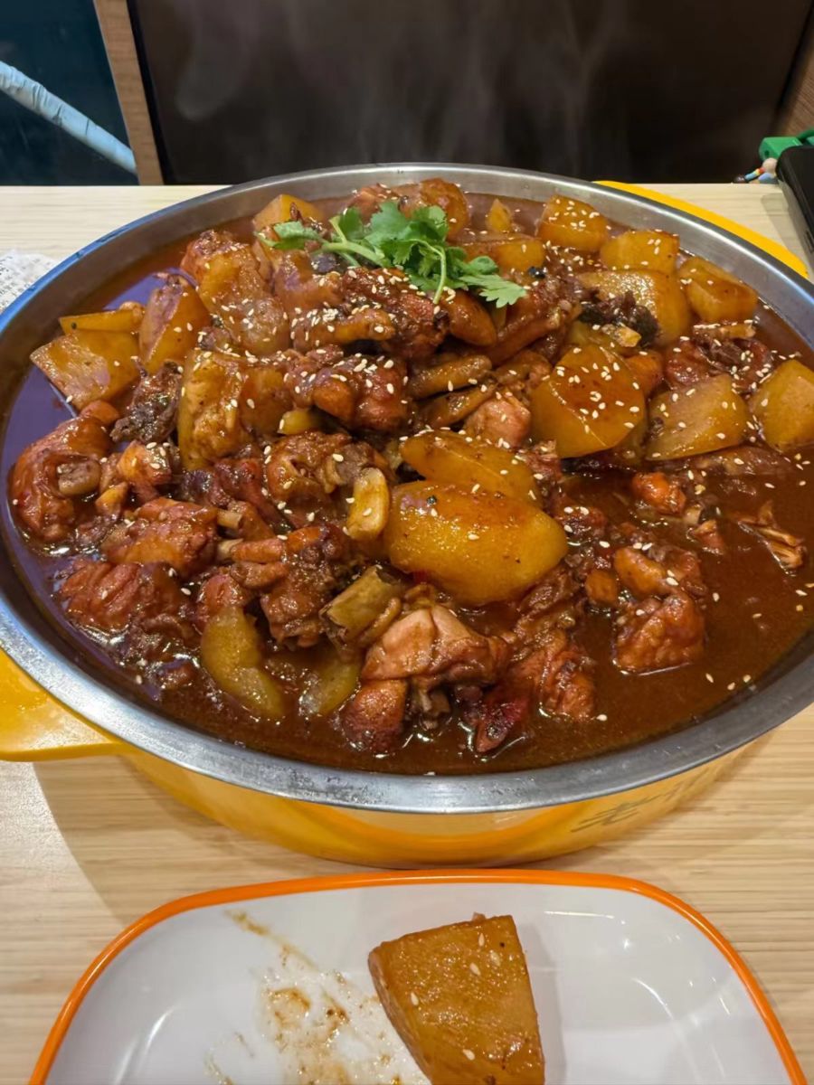 金属盆沿衬着黄亮的锅身,满满当当的分量透着十足的烟火气。下方餐盘里剩下的一块土豆,还挂着浓郁的酱汁,仿佛在诉说这道菜的醇厚滋味。热乎的香气仿佛隔着屏幕扑面而来,每一口都是咸香浓郁、肉烂薯糯的满足感,是实打实的下饭硬菜。