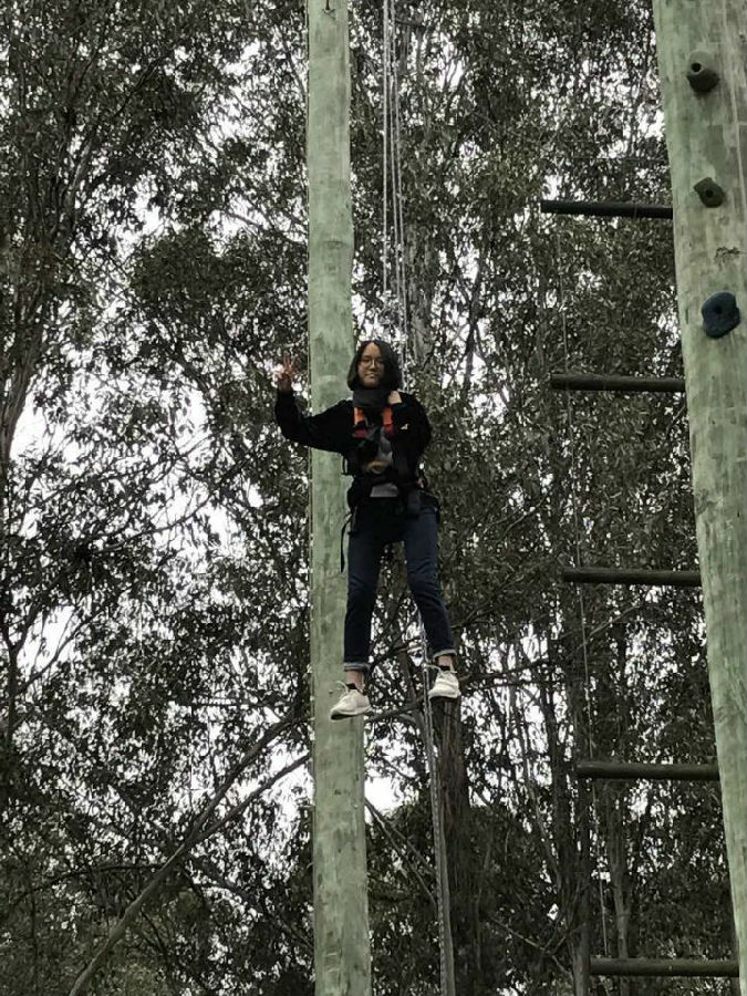 初生牛犊不怕虎,小编第一个举手请求尝试做攀爬者。大家在下面开动脑筋,想如何铺稳箱子的地基,我和另一个伙伴按照他们的指令跨上箱子。在搭建的过程中,因为我没站稳还带了些箱子顺势滑了下去,不过他们没有放弃,在第一次就取得了不错的成绩。