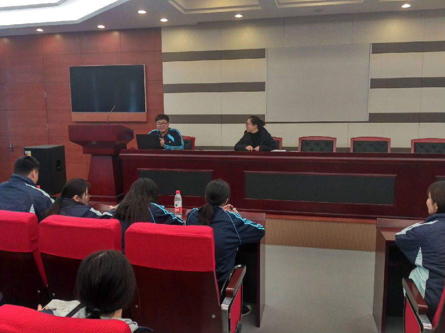 虞老师和学生会主席给全校宣传委员开会