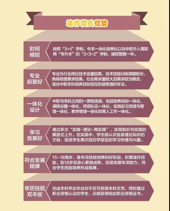 全面贯通培养,积淀专业底蕴,培育时代工匠。学校设有计算机、财经、商务3个教学系,拥有11个中本贯通、中高职贯通和10个中专专业及方向。